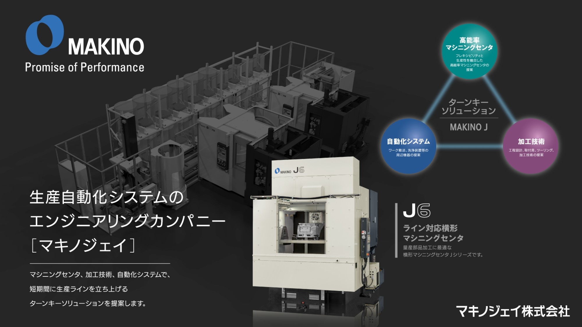 高速・高精度を極めたマキノの工作機械を核に、加工方法の設計、治具・工具開発、ロボット・自動化システムの構想までを一体でエンジニアリングし、量産工場そのものを設計しています。