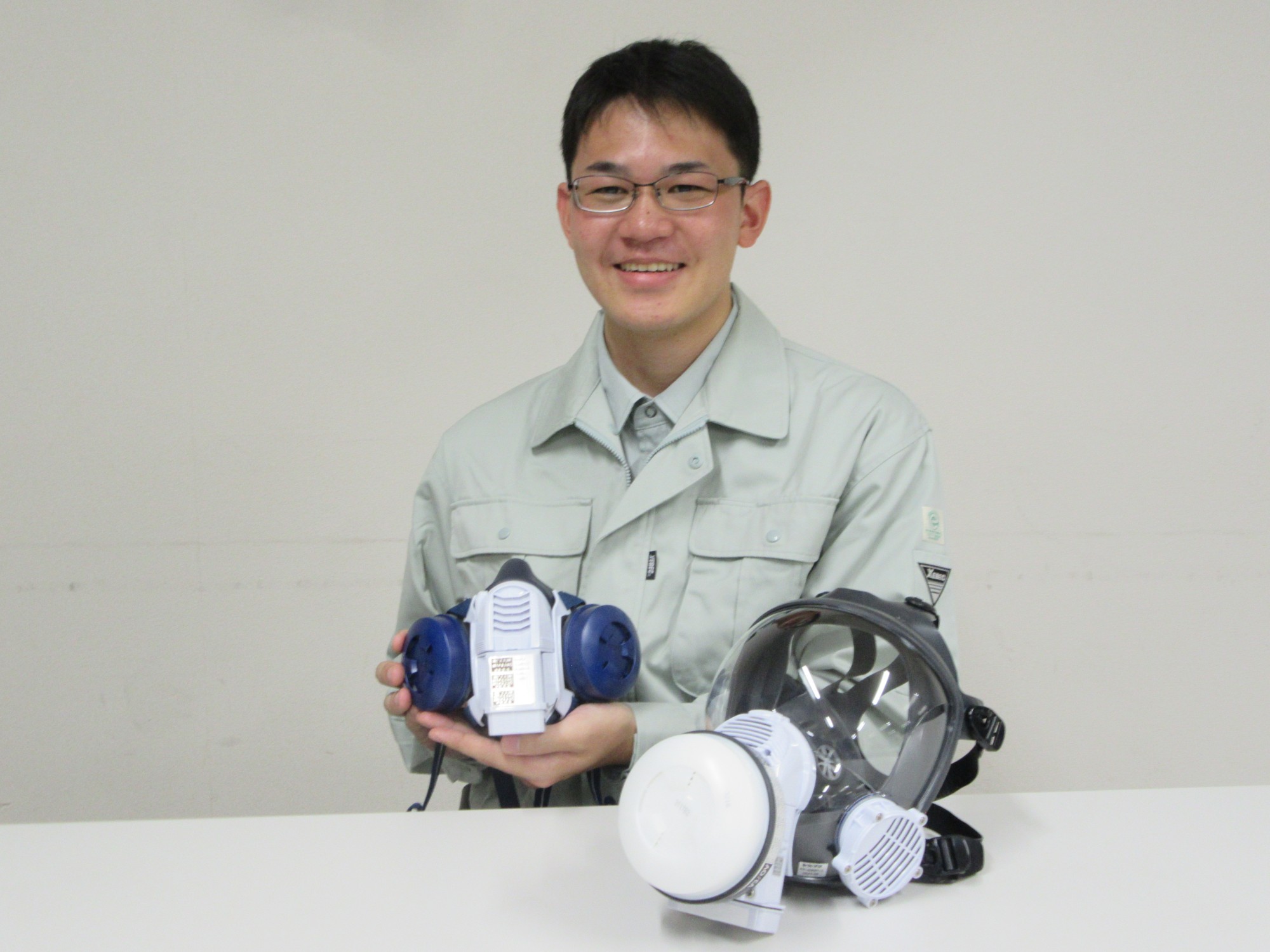 主に有機蒸気や酸性ガス等から守る「防毒マスク」、安全快適に呼吸ができる「電動ファン付き呼吸用保護具」などで呼吸する部分に用いる「吸収缶」の開発を行います。
