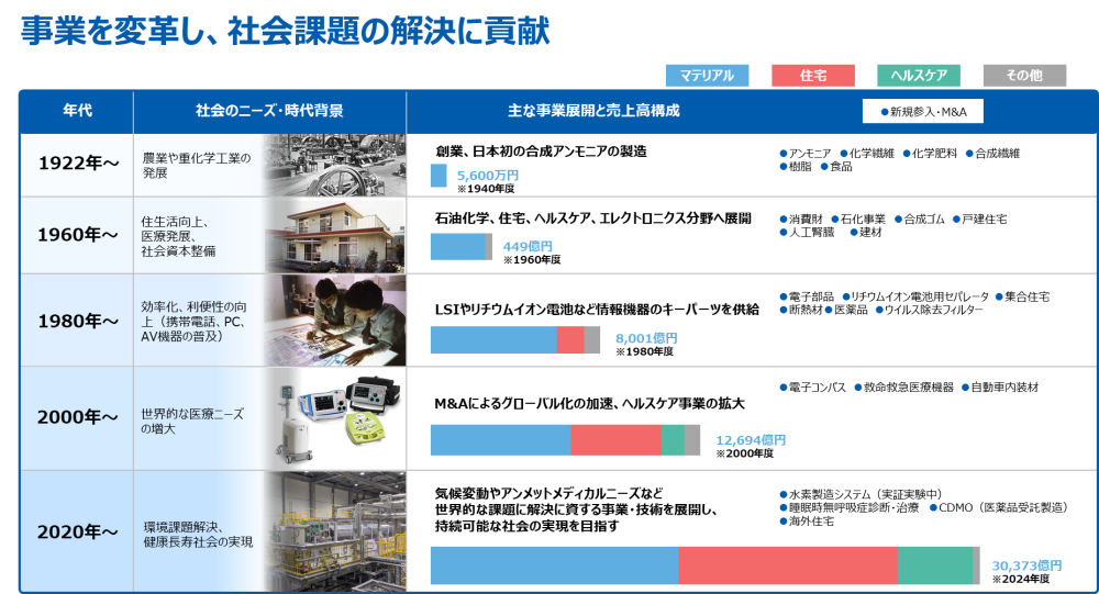 旭化成は、創業以来「化学」にとどまらず、技術を独自に融合し新しい挑戦をくり返し、時代の変遷に応じて、繊維、住宅・建材、医薬・医療、エレクトロニクスなど、多彩な事業を展開し、進化してきました。さらには環境・エネルギー分野へも展開を拡げ、技術領域も「科学」を包括するものになってきています。