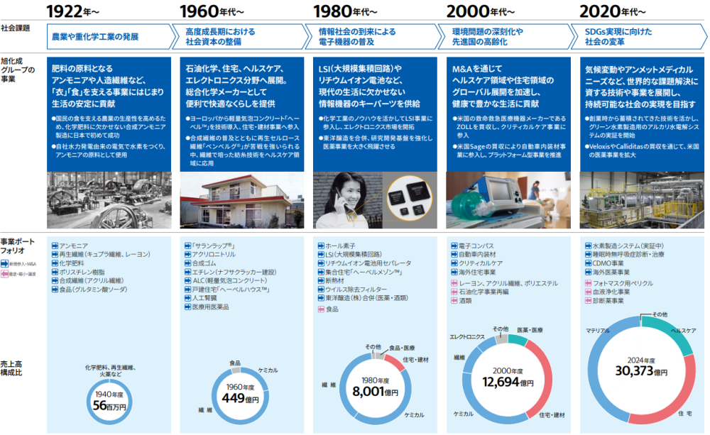 旭化成は、創業以来「化学」にとどまらず、技術を独自に融合し新しい挑戦をくり返し、時代の変遷に応じて、繊維、住宅・建材、医薬・医療、エレクトロニクスなど、多彩な事業を展開し、進化してきました。さらには環境・エネルギー分野へも展開を拡げ、技術領域も「科学」を包括するものになってきています。