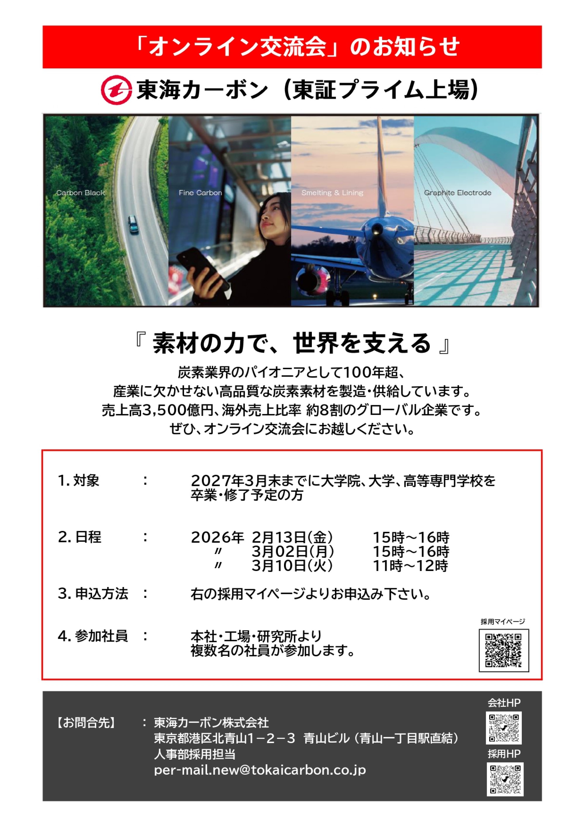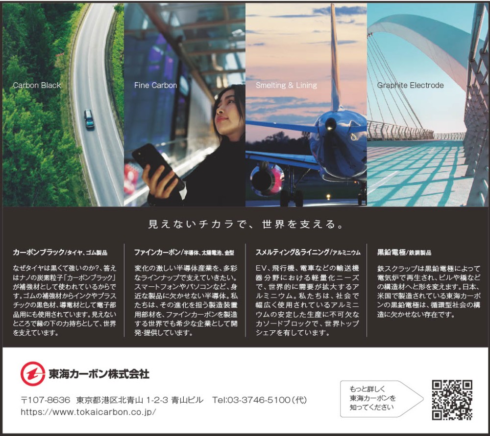 東海カーボンは、100年超の歴史を持つ総合炭素材料メーカーです。製鉄に不可欠な黒鉛電極、自動車タイヤの強度を高めるカーボンブラック、半導体製造に用いるファインカーボンなど、幅広い産業を支える素材を提供しています。近年は、リチウムイオン電池の負極材など、成長分野にも注力。素材の可能性を追求し、より豊かな社会の実現に貢献しています。世界を舞台に活躍できるフィールドが、東海カーボンにはあります。