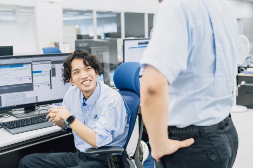 同じチームのメンバーと、たくさんコミュニケーションを取りながら仕事をしています。また、一人一台大型のモニターやリクライニング式のイスが用意され、「働きやすさ」にこだわったオフィスです。